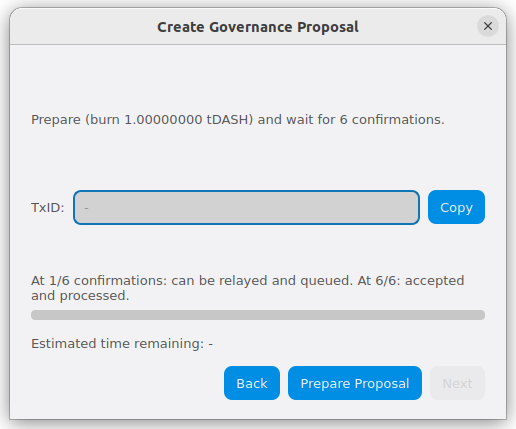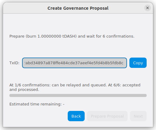 Step 3: Creating the proposal transaction and waiting for 6 confirmations of the transaction ID#