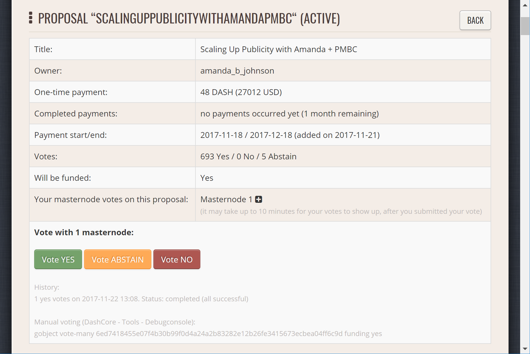 Voting from the debug console in Dash Core Wallet#
