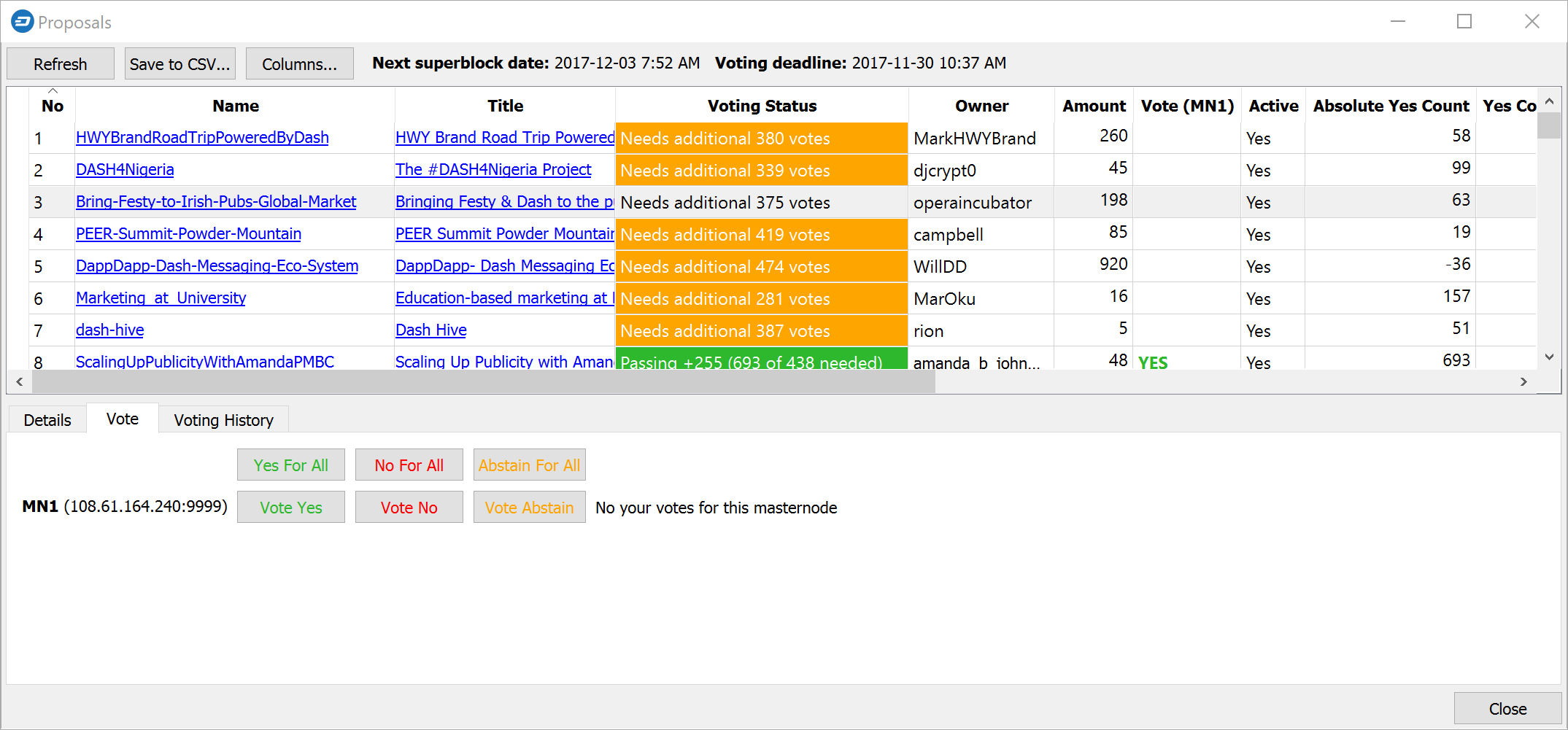 If you started your masternode from a hardware wallet using DMT, you can also use the tool to cast votes. Click Tools > Proposals and wait for the list of proposals to load. You can easily see the voting status of each proposal, and selecting a proposal shows details on the Details tab in the lower half of the window. Switch to the Vote tab to Vote Yes, Vote No or Vote Abstain directly from DMT.
