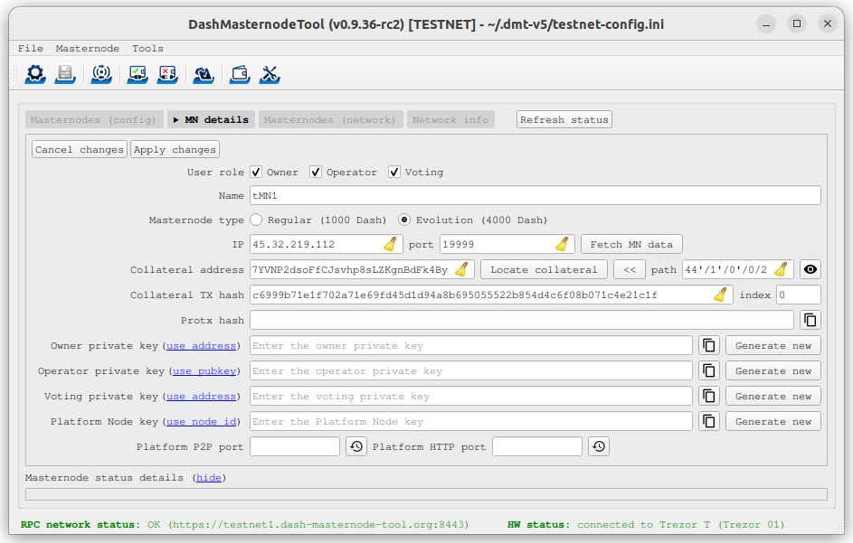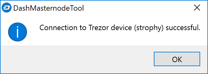 Click the third button from the left Check Dash Network Connection in the top left corner of the main window to verify that the connection is working. Then connect your Trezor device and click the next button Test Hardware Wallet Connection to verify the hardware wallet connection is working.