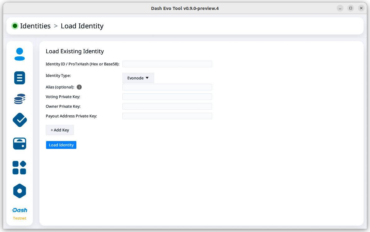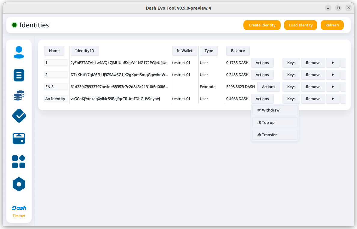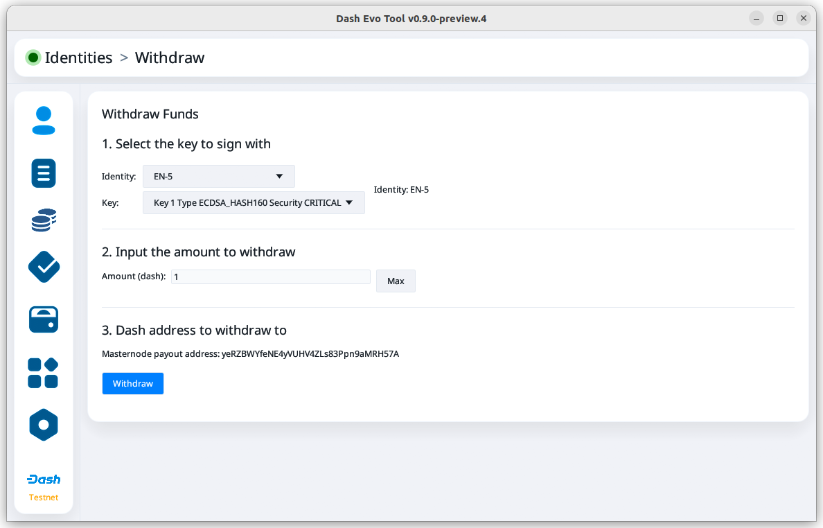 Once the identity is loaded, you can view its balance and details about its keys. For evonodes, you can also initiate withdrawals.