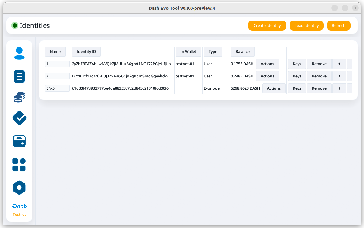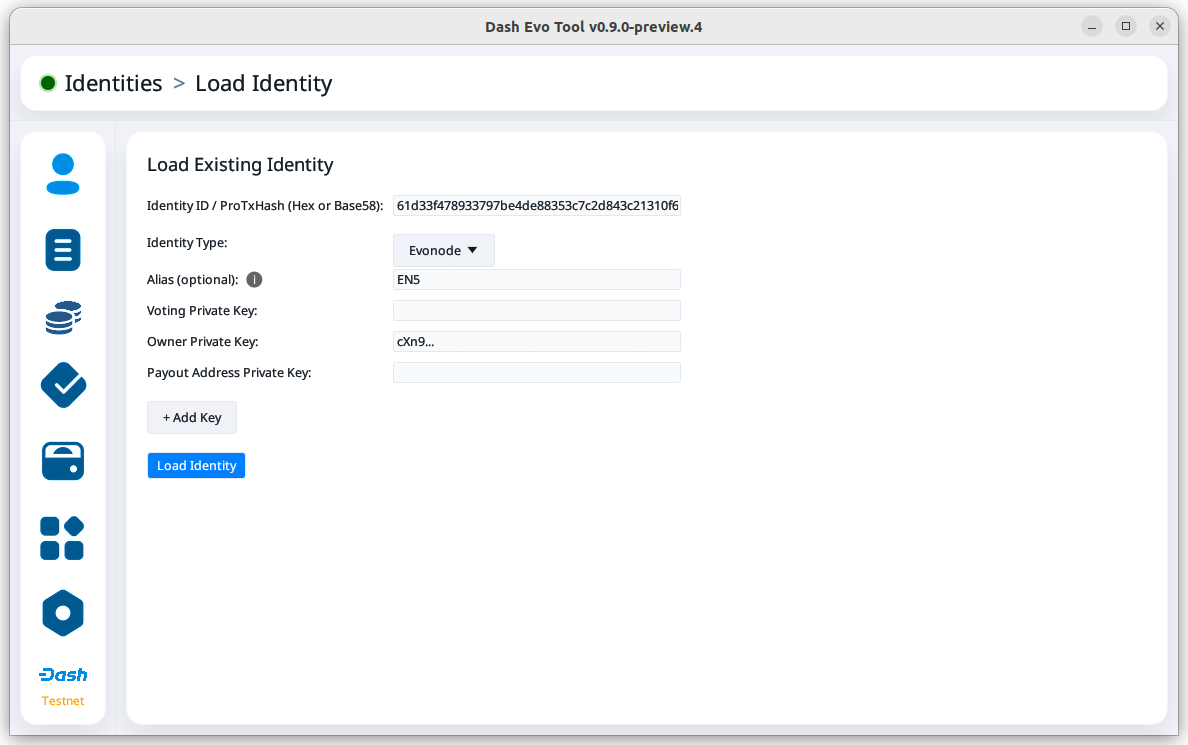 Identity screen with an evonode identity loaded#
