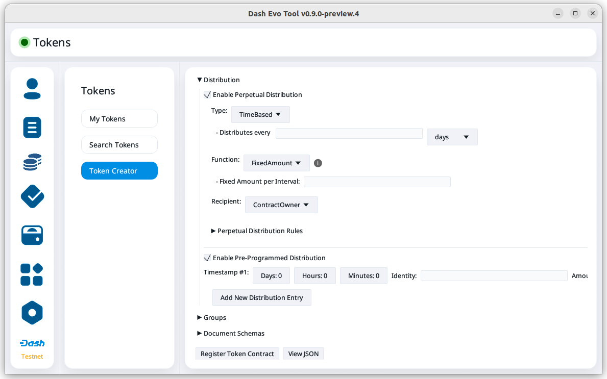 The Token Creator screen provides a comprehensive interface for creating and registering tokens on Dash Platform. It covers all configurable token attributes, ranging from basic supply details to advanced control mechanisms and distribution rules.