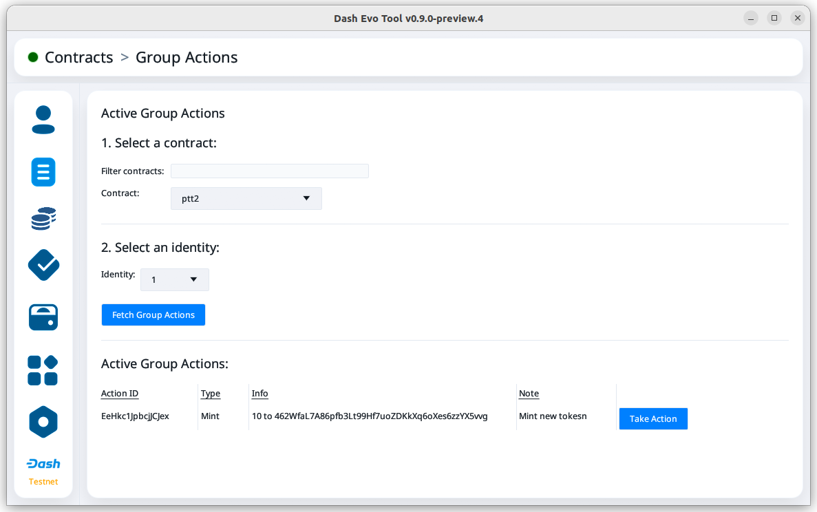 The Group Actions screen allows querying group action requests. Select a contract and an identity, then click Fetch Group Actions to see all related group actions request.
