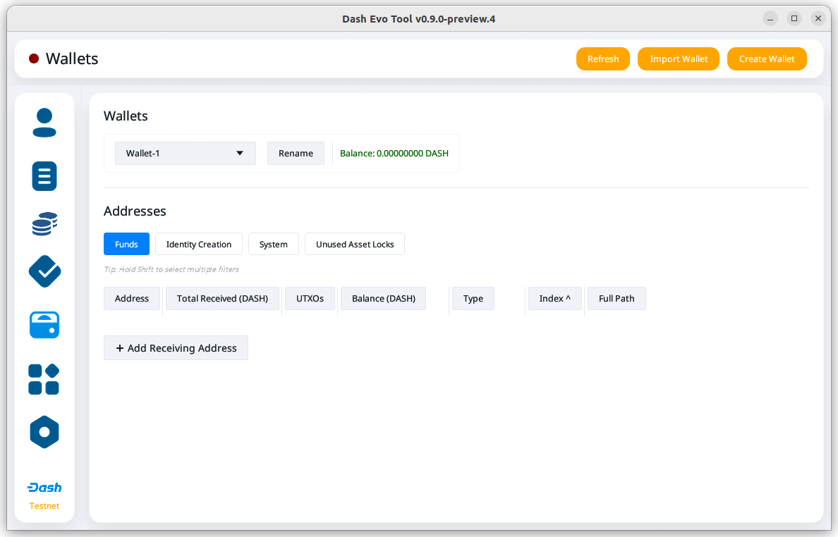 Since this tool adds watching-only addresses to Dash Core when creating identities, it is recommended to close all existing Dash Core wallets and create a new wallet for the Dash Evo Tool. Also, make sure to backup your Dash Core wallet.