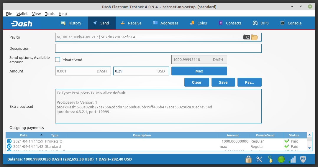 The ProUpRegTx information required to update the masternode registration was filled out by the previous step so just Click Pay… to complete the update.