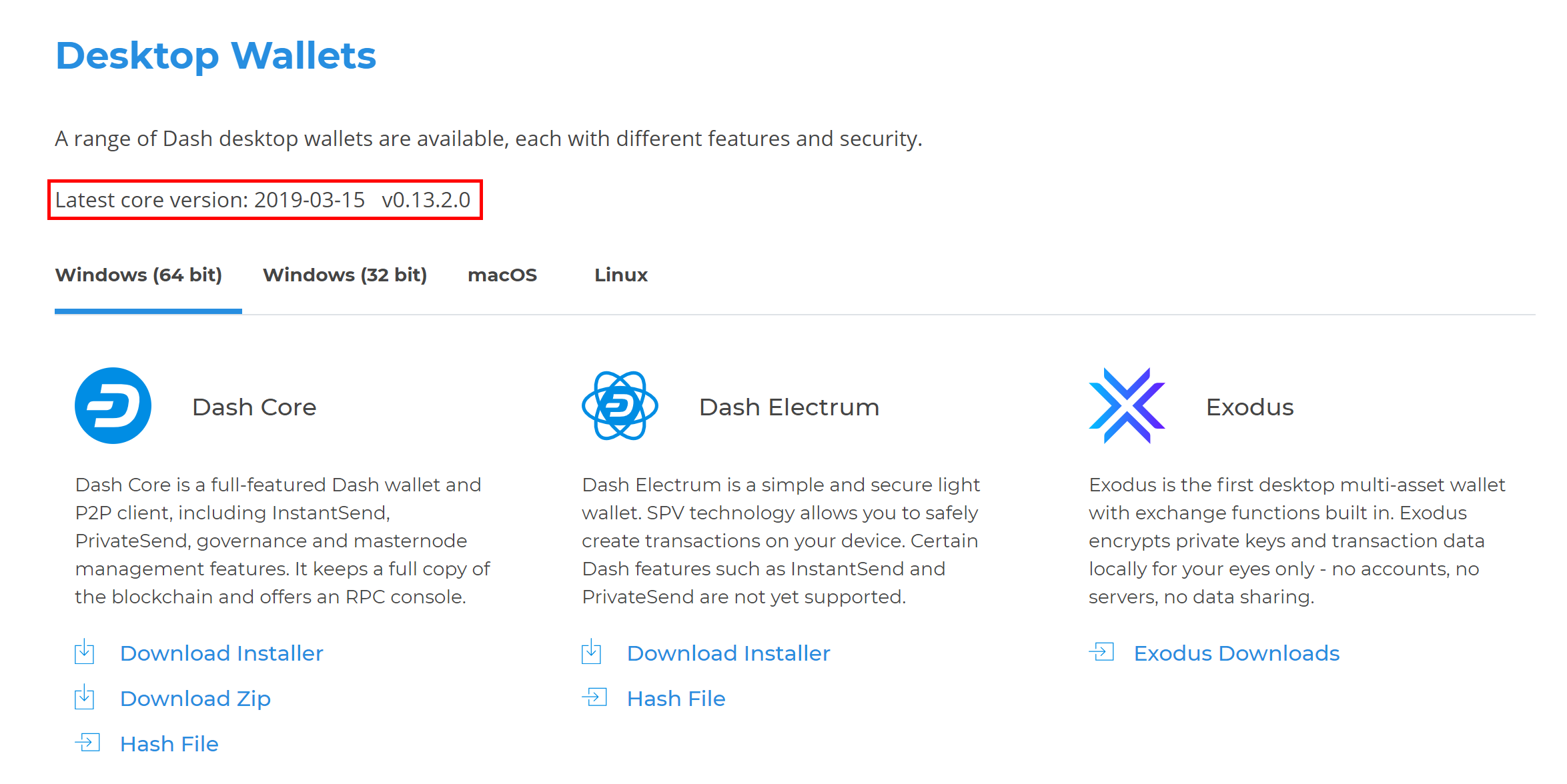 Comparing the installed version of Dash Core with the latest version available on the website#